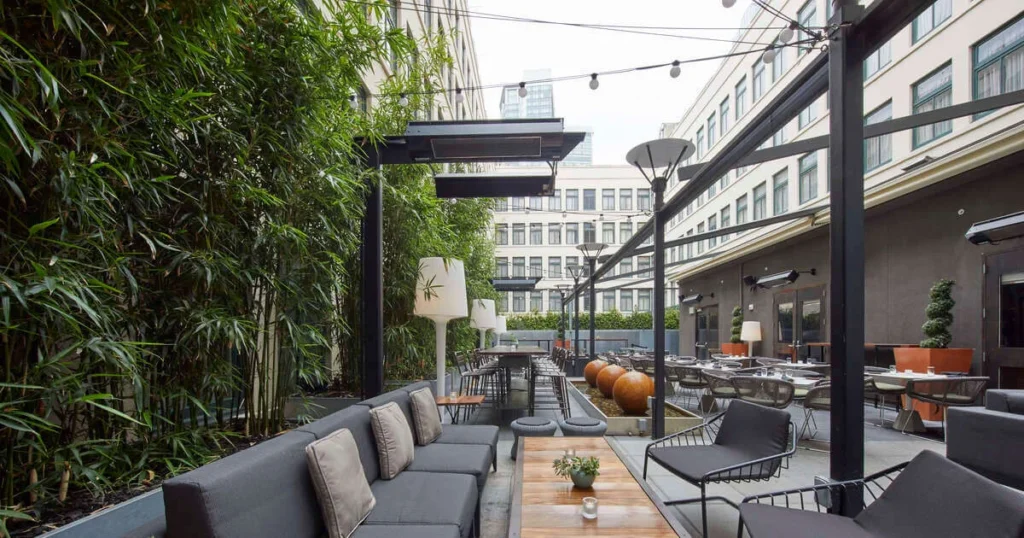 Cocktails $16 to $20, whiskey pours vary widely by bottle, food entrees $18 to $35. Happy hour (4pm to 6pm daily) is the best deal; the patio on a clear evening is the best seat. At 12 4th Street, 5th floor. Powell BART/Muni is a 3-minute walk. Steps from Union Square and Moscone Center.