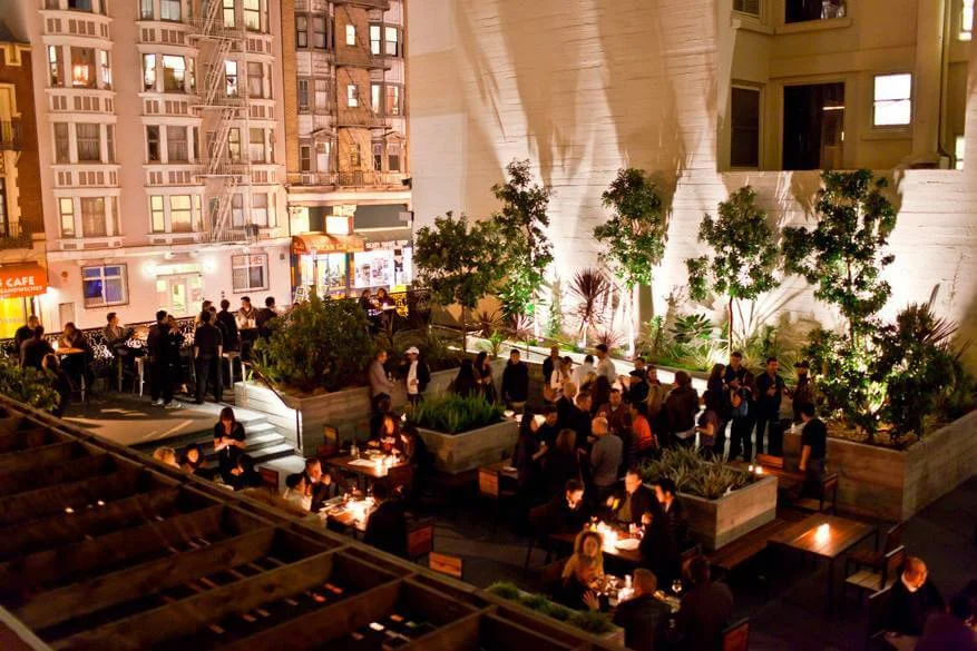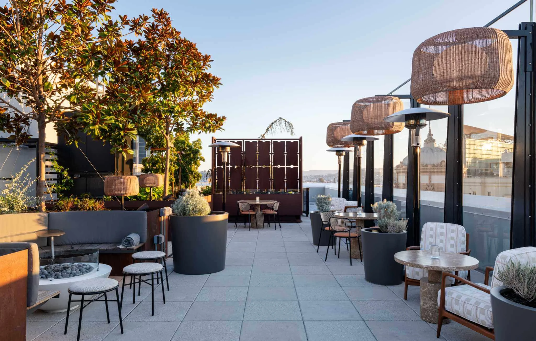 A rooftop bar at the Timbri Hotel near Union Square with a glass-ceilinged solarium, skyline views, fire pit seating, and American-Asian cuisine. One of San Francisco’s newer elevated drinking spots.