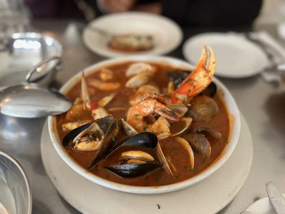 Cioppino: The signature. Tomato broth, Dungeness crab, clams, mussels, prawns, fish.