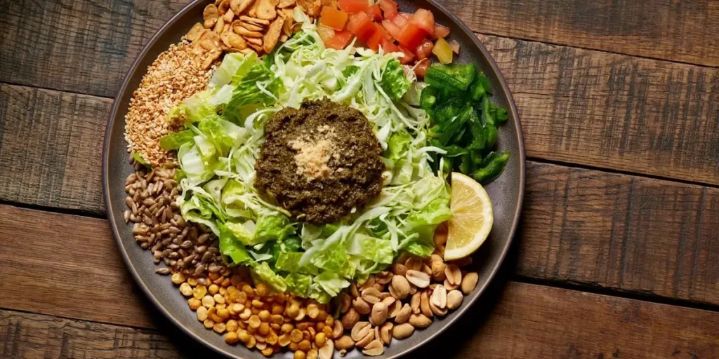 The tea leaf salad is the dish that built the reputation. Fermented tea leaves tossed with fried yellow beans, sesame seeds, dried shrimp, jalapeños, tomatoes, and lime. Sour, spicy, and salty at once. Mixed tableside.