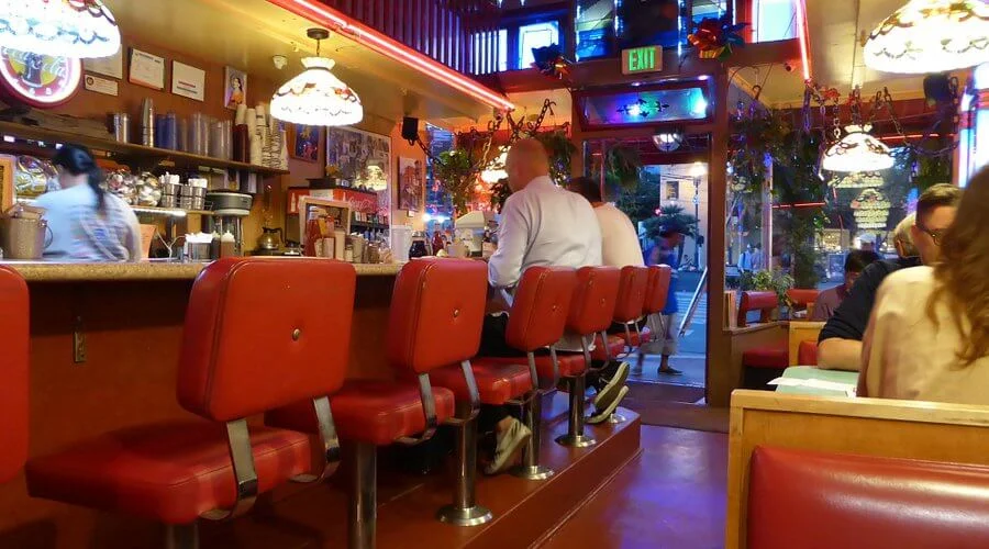 Orphan Andy’s opened on 17th Street in the Castro in 1977. Owners Dennis Ziebell and Bill Pung have run it together since 1978 and have been a married couple for nearly as long. Booths, a counter, neon, and jukeboxes at every table. Decor that reads as 1950s diner without being a theme. The Castro’s late-night anchor for nearly fifty years.