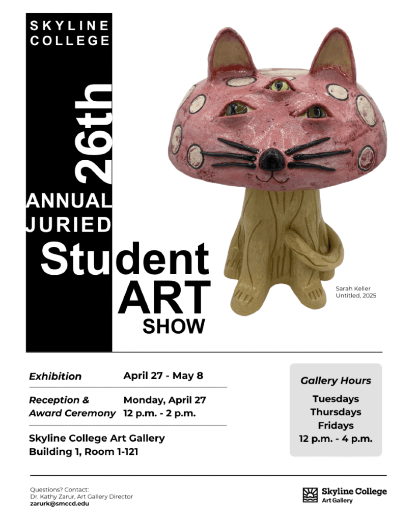 Skyline College’s 26th Annual Juried Student Art Show opens with a reception and award ceremony on April 27. It’s a great chance to see what students across the college are creating, from absolute beginners to more experienced artists. The show celebrates student creativity and artistic growth. Head over at noon to check out the work and catch the awards ceremony.